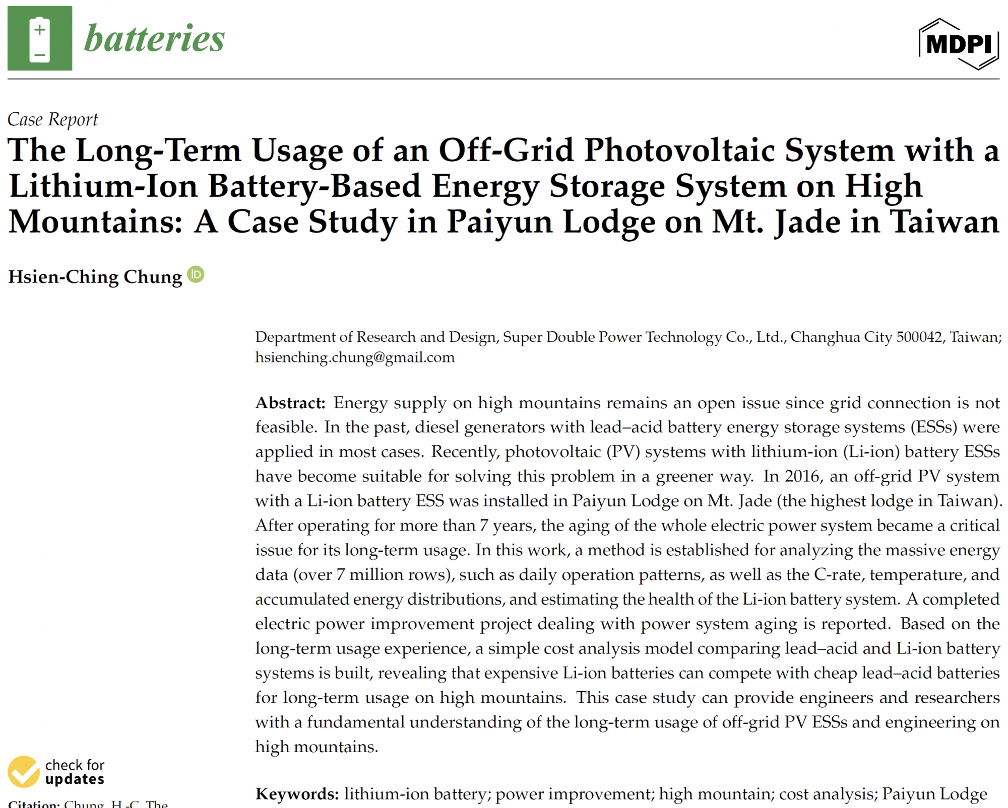 Our company's RD manager, Dr. Hsien-Ching Chung, published a paper entitled "The Long-Term Usage of an Off-Grid Photovoltaic System with a Lithium-Ion Battery-Based Energy Storage System on High Mountains: A Case Study in Paiyun Lodge on Mt. Jade in Taiwan." The journal Batteries contributes the company's research and development results related to the long-term use of lithium-ion batteries and its experience in high mountain engineering to academic and industrial circles.